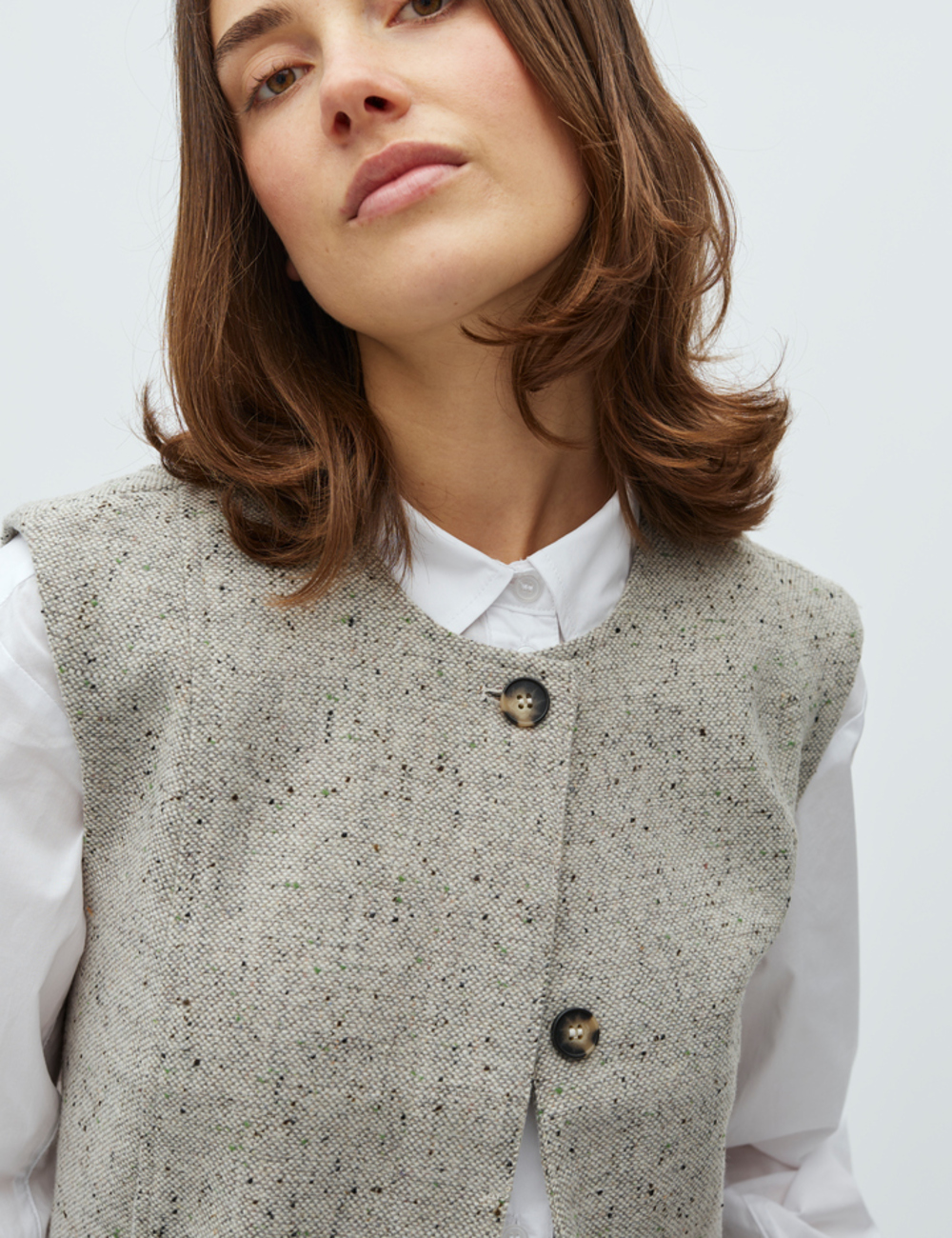Sleeveless waistcoat with button detail at neck.