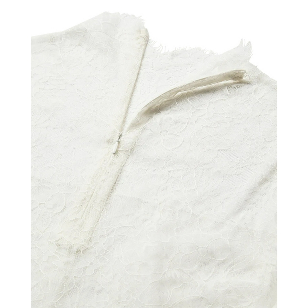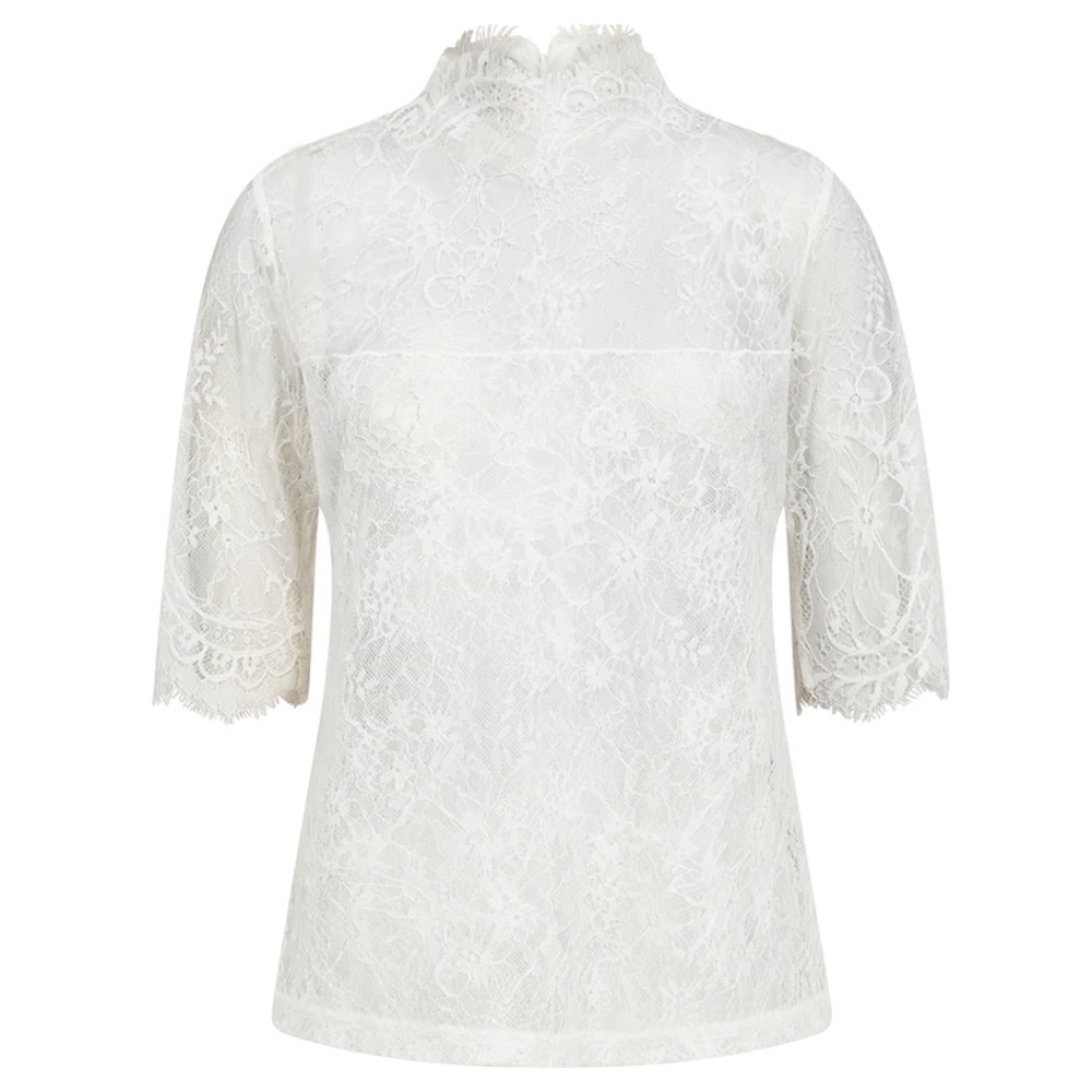 CMLEA-BLOUSE is a tight-fitting blouse in a premium eyelash lace material with a high neck, concealed back zip fastening, half sleeves as well as light lining on the front.