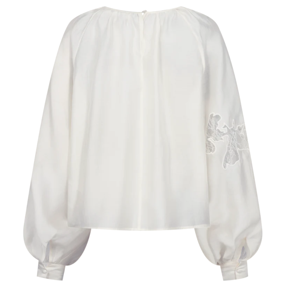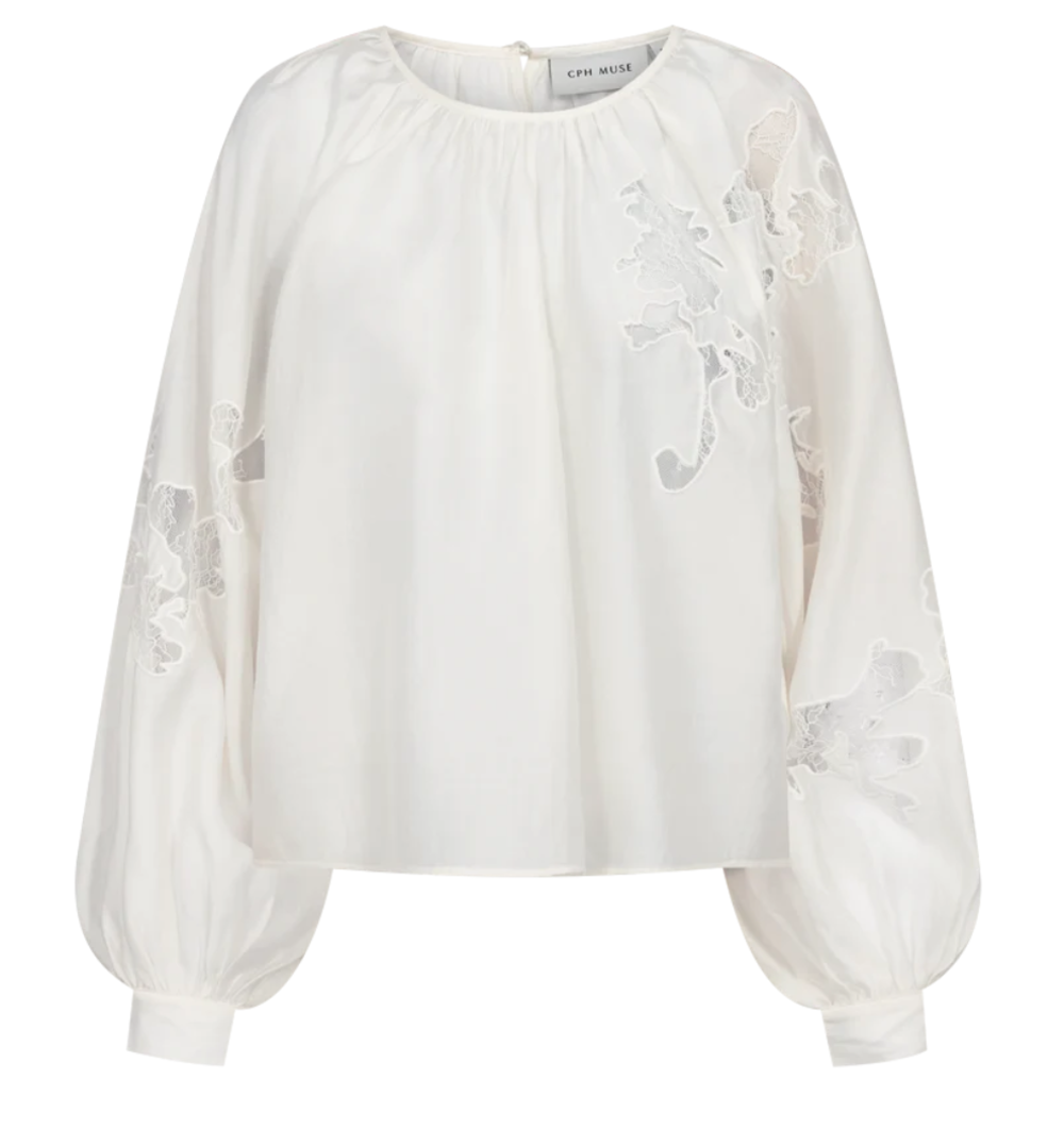 CMMOLLY-BLOUSE is a blouse in a premium material with long, voluminous sleeves with a narrow cuff, slit with button at the neck, gathered detailing in the neckline and cut-and-sew lace for an elegant sneak peek at the skin.