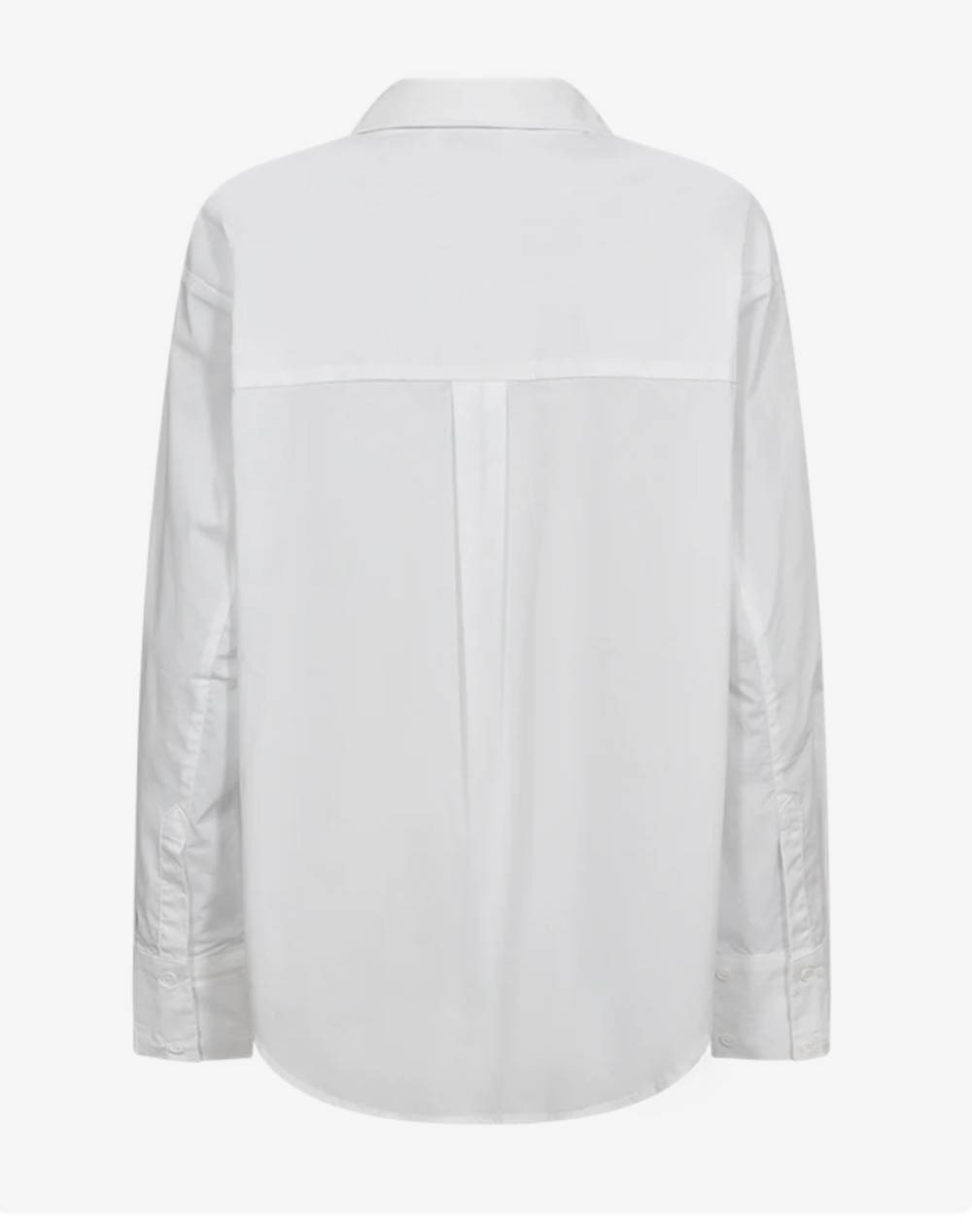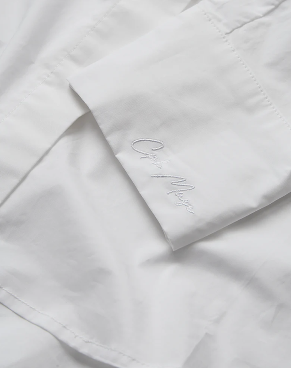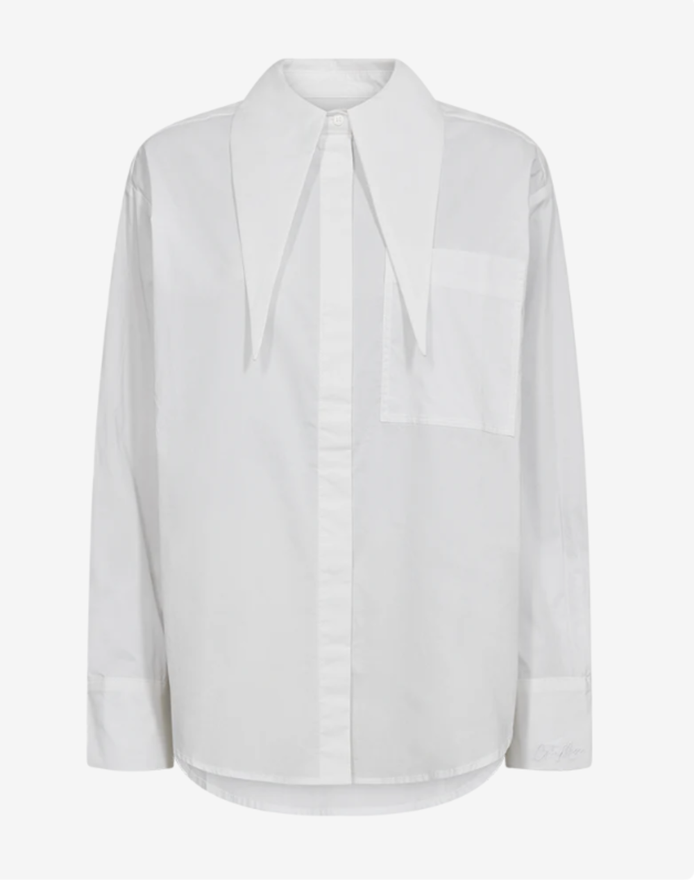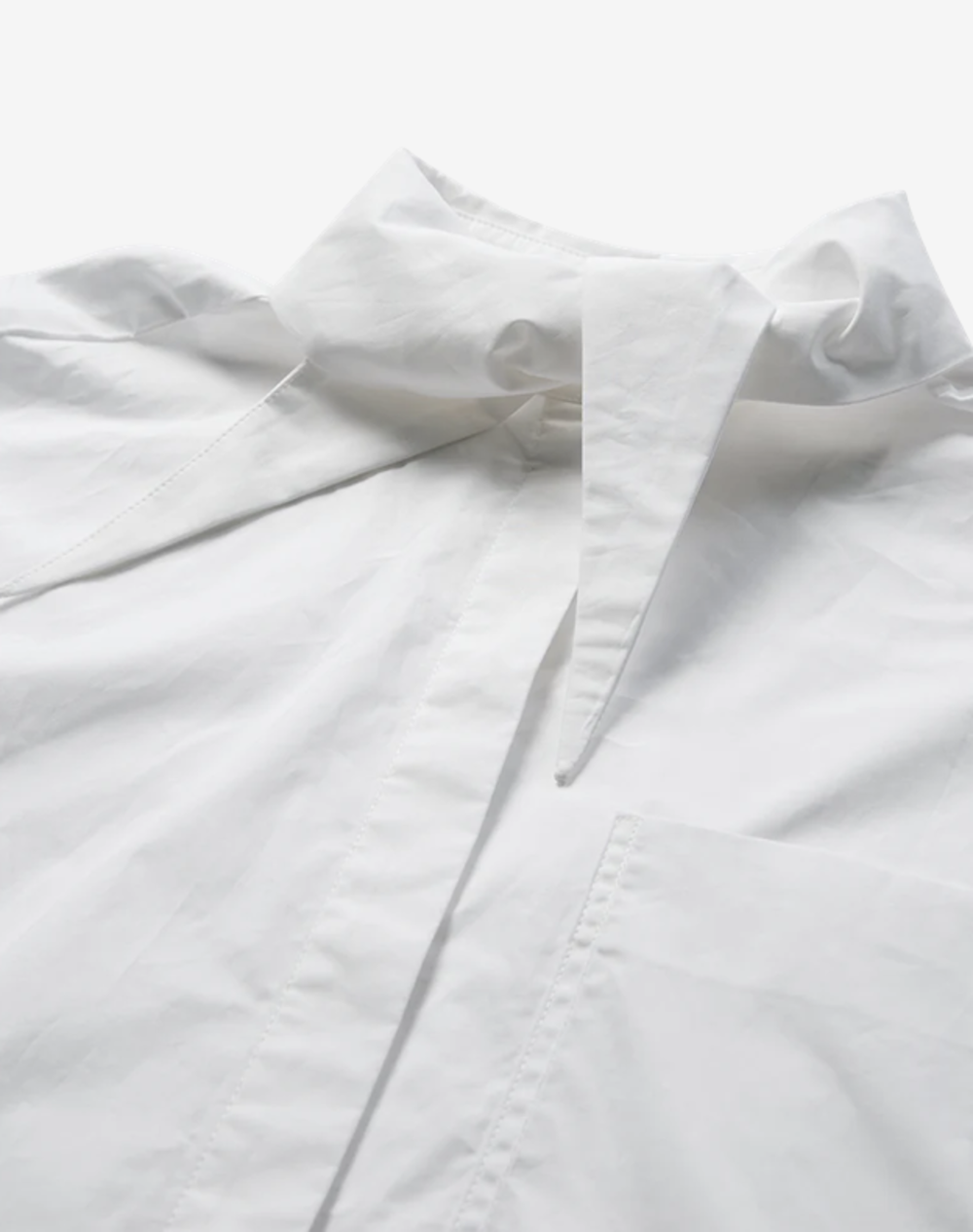 CMPOPLIN-SHIRT is a long-sleeved button-up blouse cut from smooth, crisp cotton poplin. The oversized silhouette features dropped shoulders, longer curved back hem, and a back box pleat for natural structure. The design is defined by its elongated collar that can be tied in a knot and styled as a small scarf, adding a versatile detail. Tonal signature embroidery at the adjustable cuff.