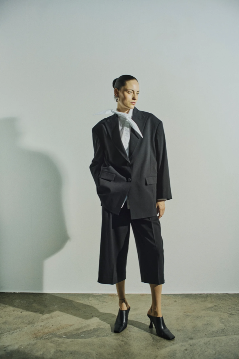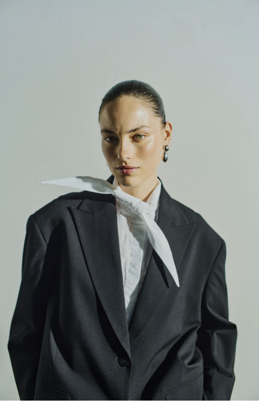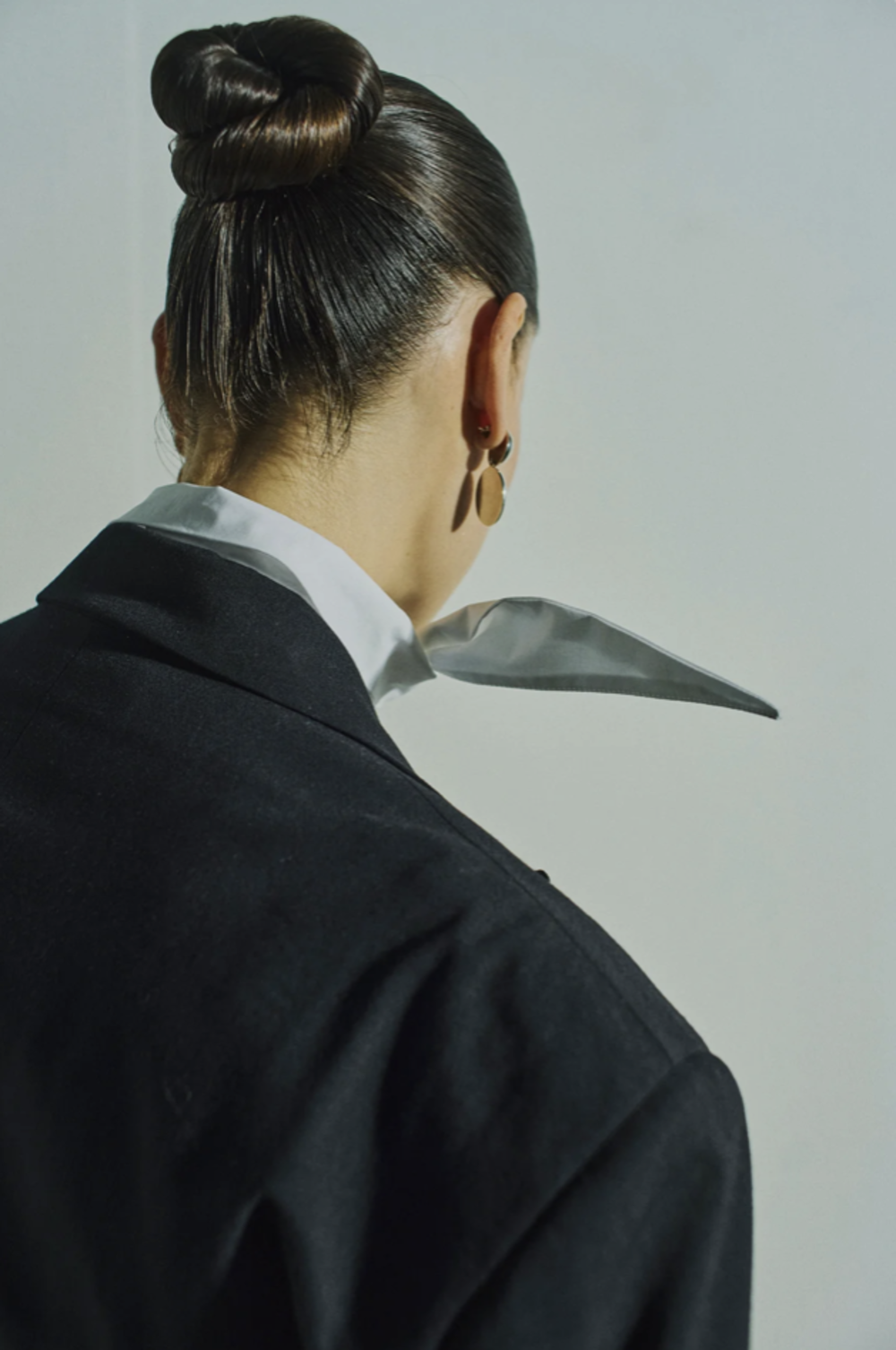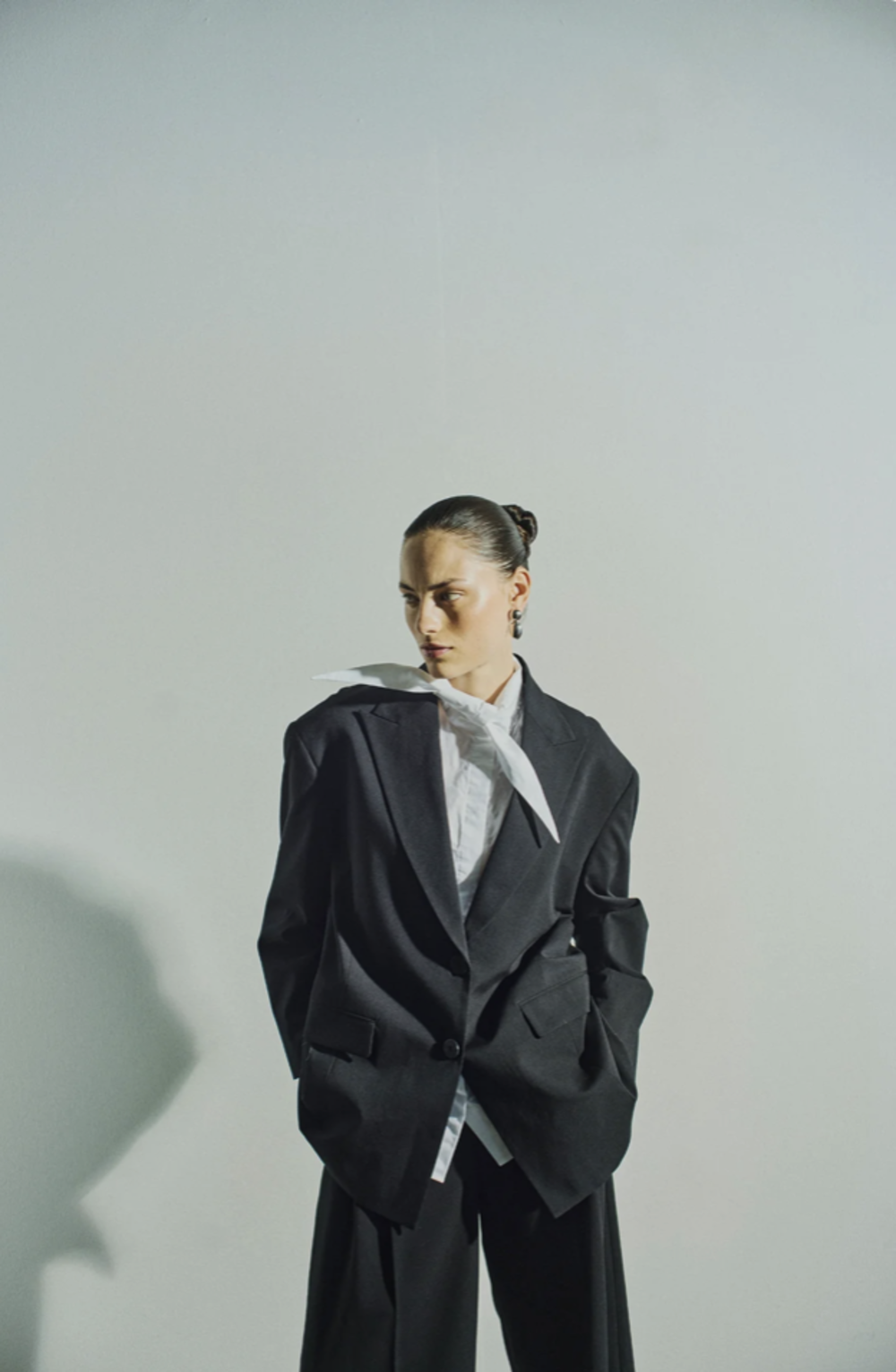 CMPOPLIN-SHIRT is a long-sleeved button-up blouse cut from smooth, crisp cotton poplin. The oversized silhouette features dropped shoulders, longer curved back hem, and a back box pleat for natural structure. The design is defined by its elongated collar that can be tied in a knot and styled as a small scarf, adding a versatile detail. Tonal signature embroidery at the adjustable cuff.