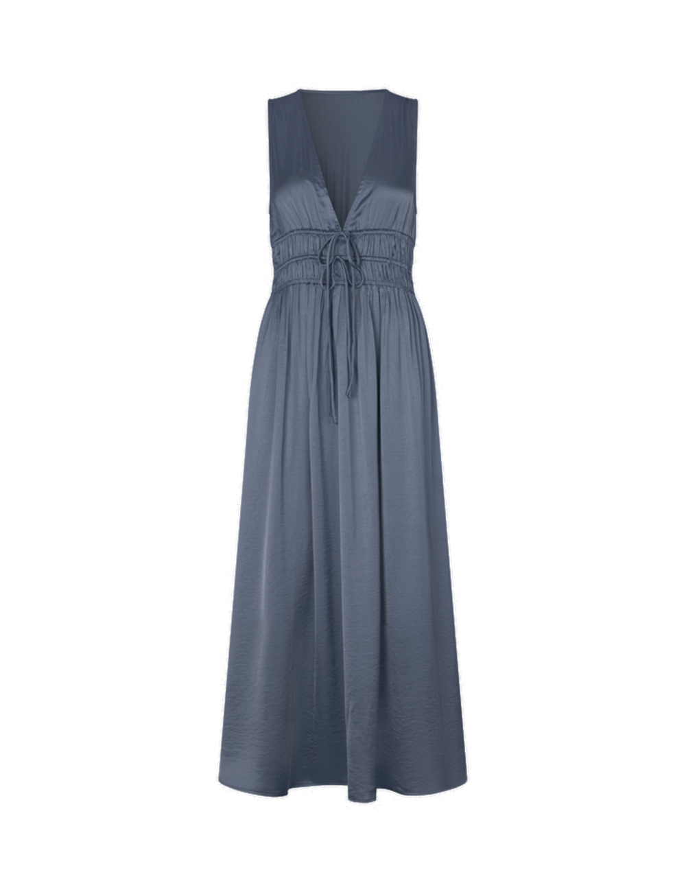 Satin maxi dress has a v-neck with a drawstring.