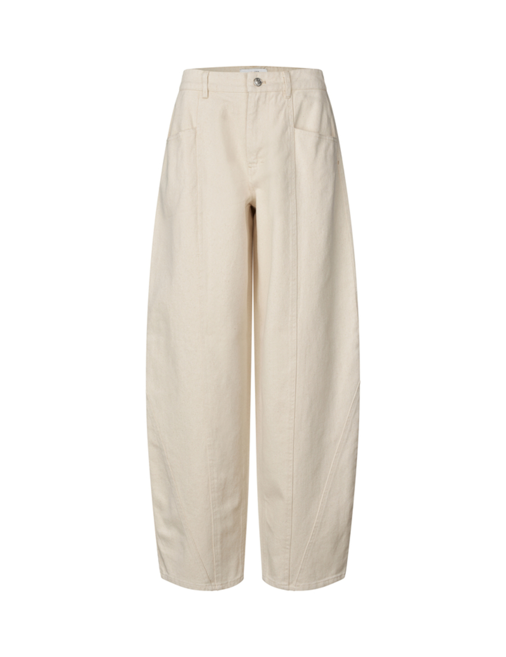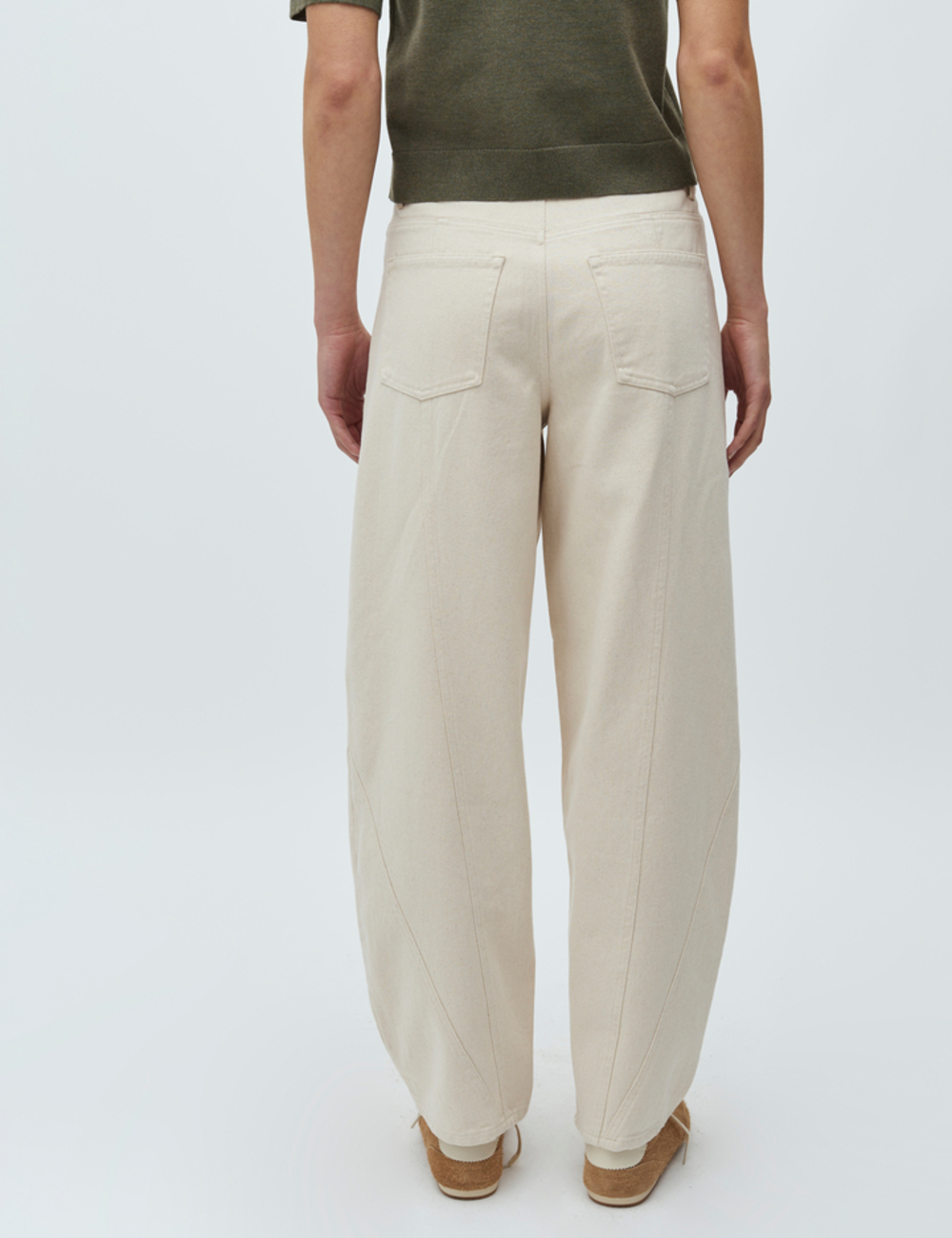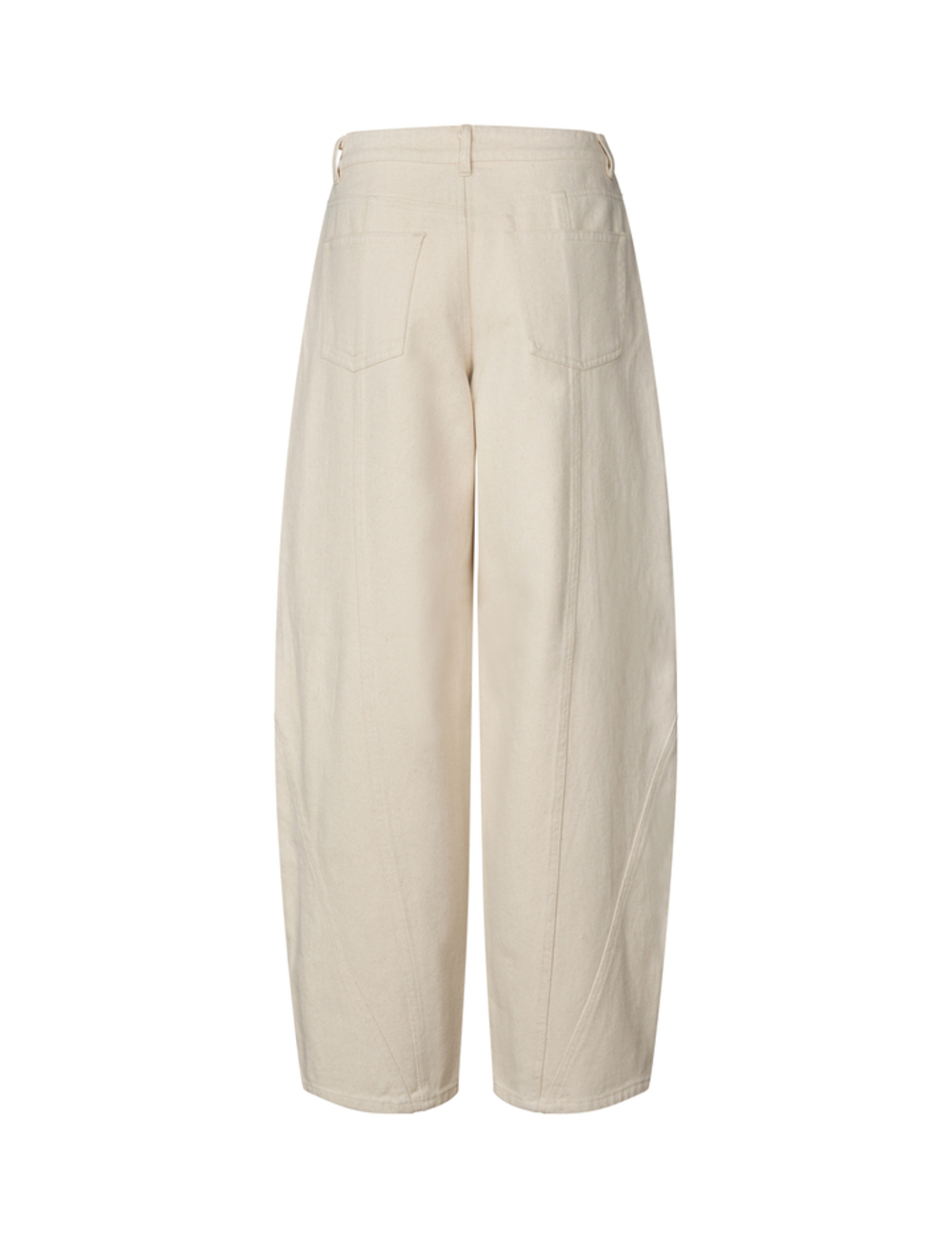 - Curved, voluminous legs with a loose fit around hips and waist.