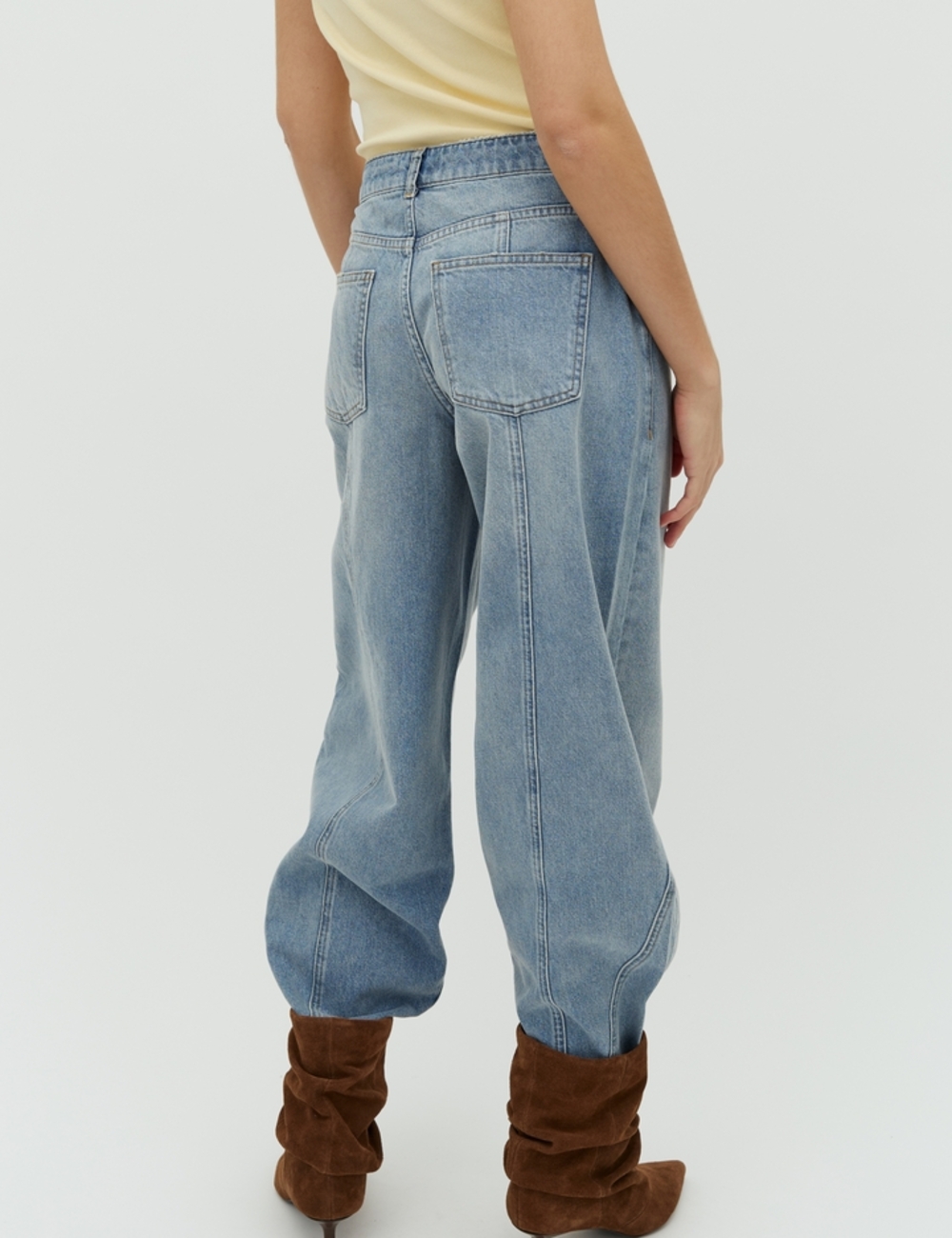 - Curved, voluminous legs with a loose fit around hips and waist.