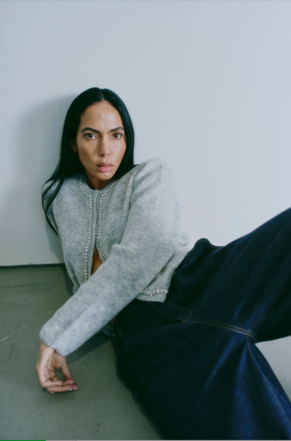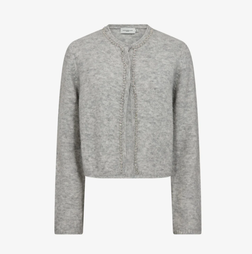 CMIBRA-CARDIGAN is a short, wide cardigan in a premium, knitted material with long sleeves, a concealed snap fastening at the top, narrow ribbing as well as elegant rhinestones along the neckline and front.