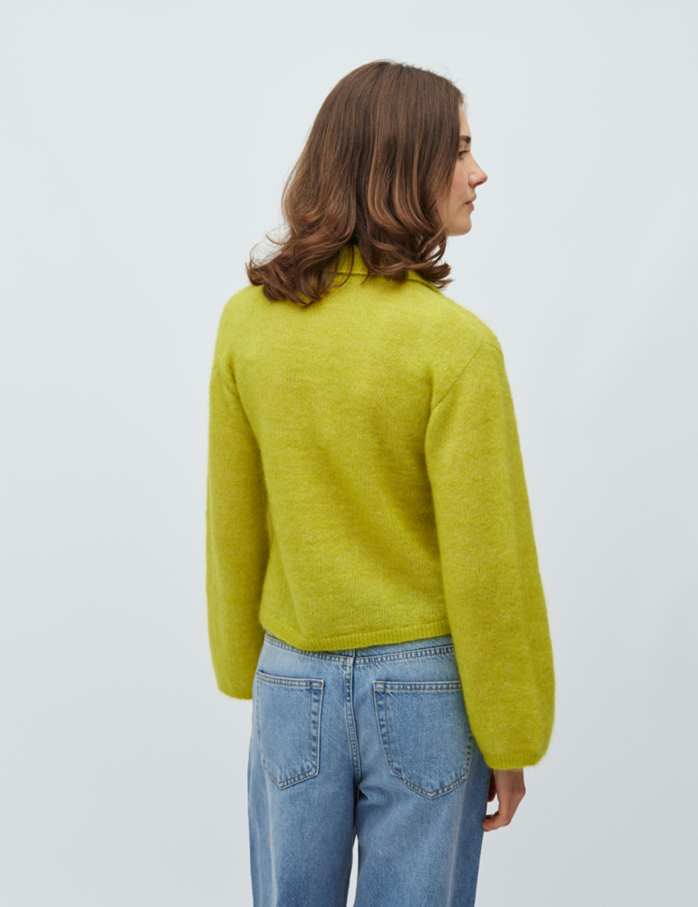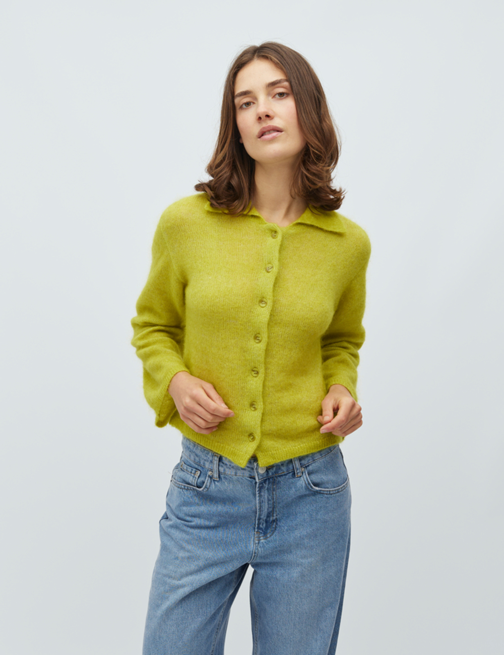Long sleeve cardigan with buttons along front.