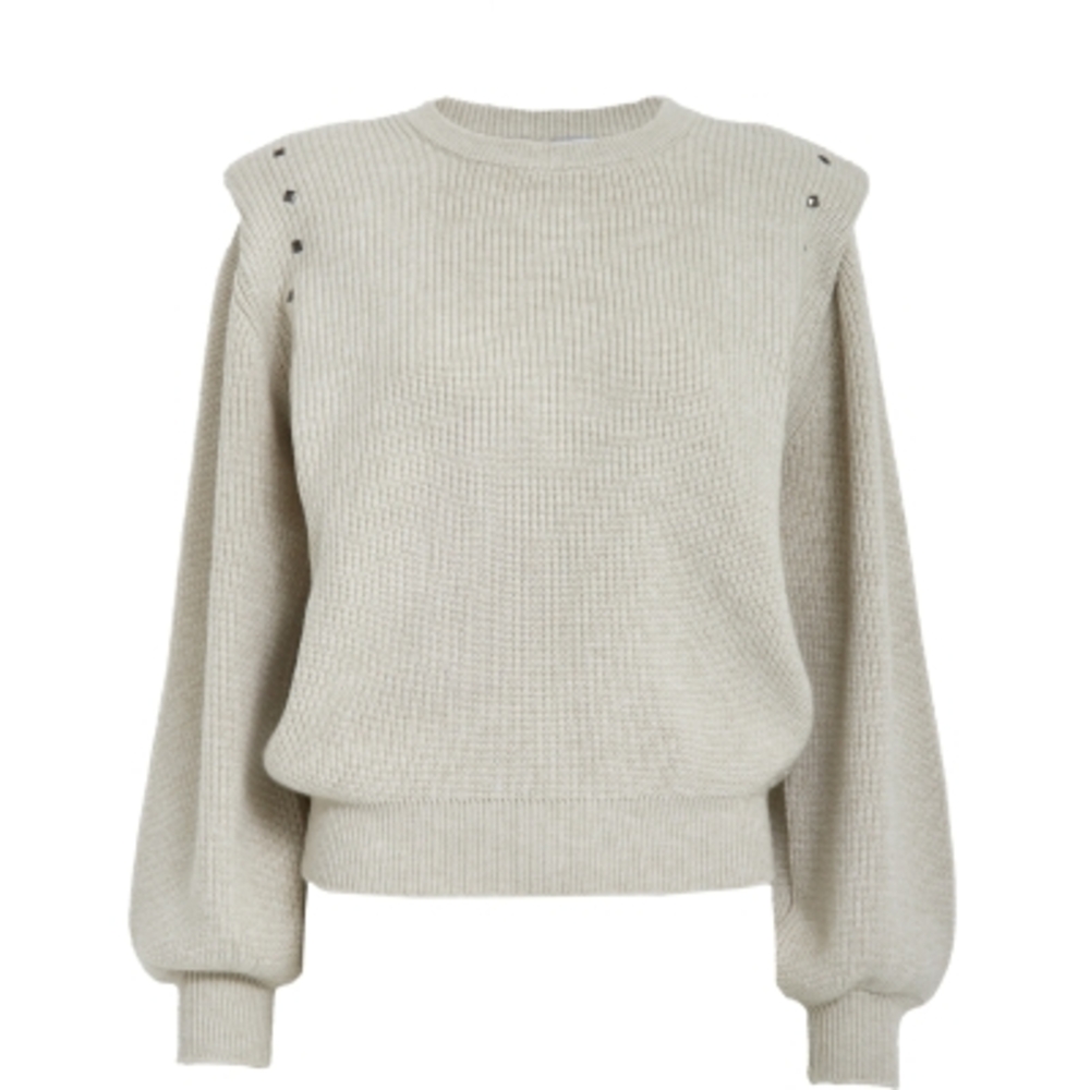 Knit with shoulder pads and studs at the shoulder.