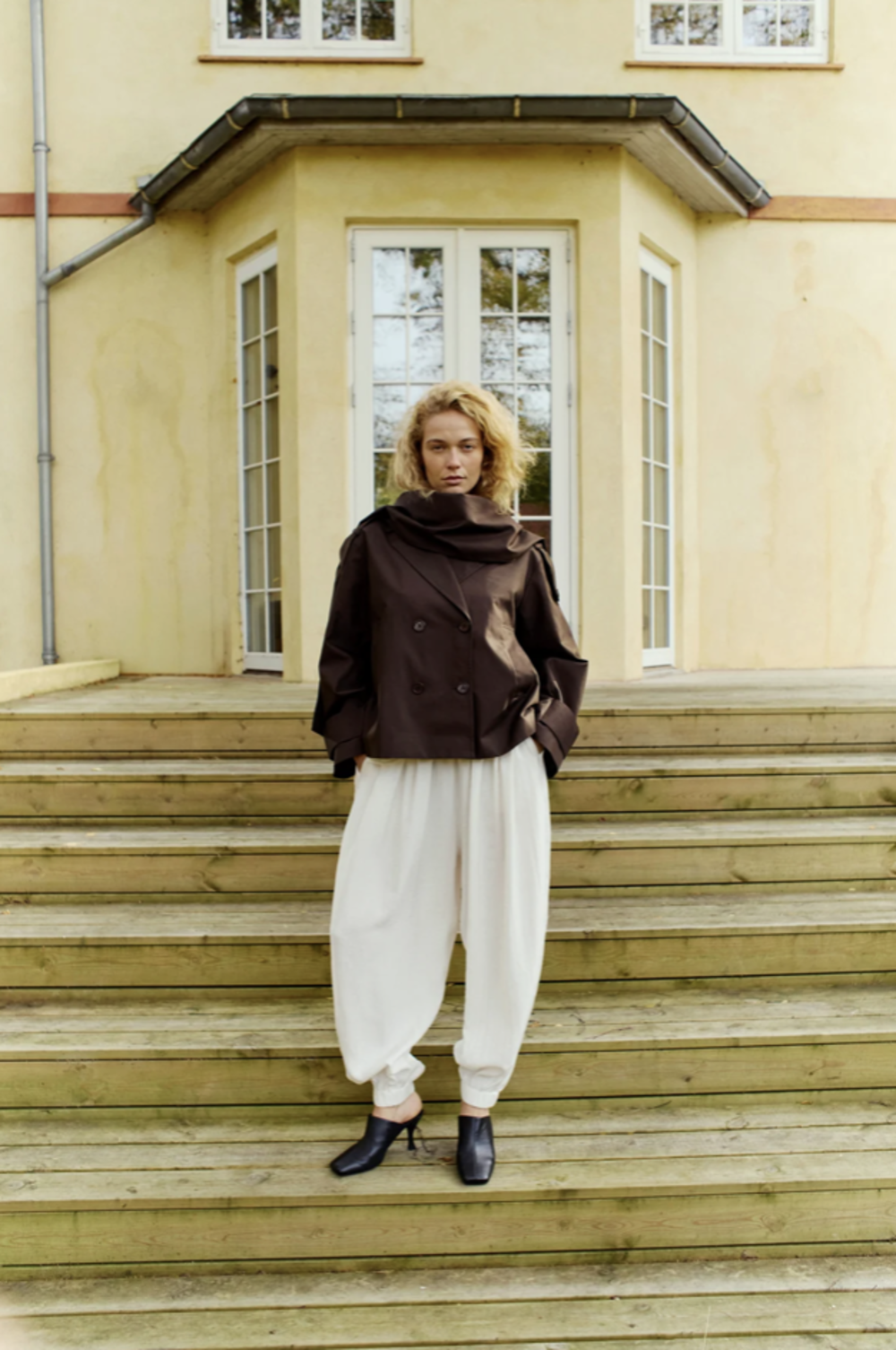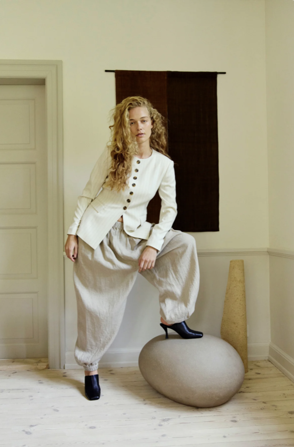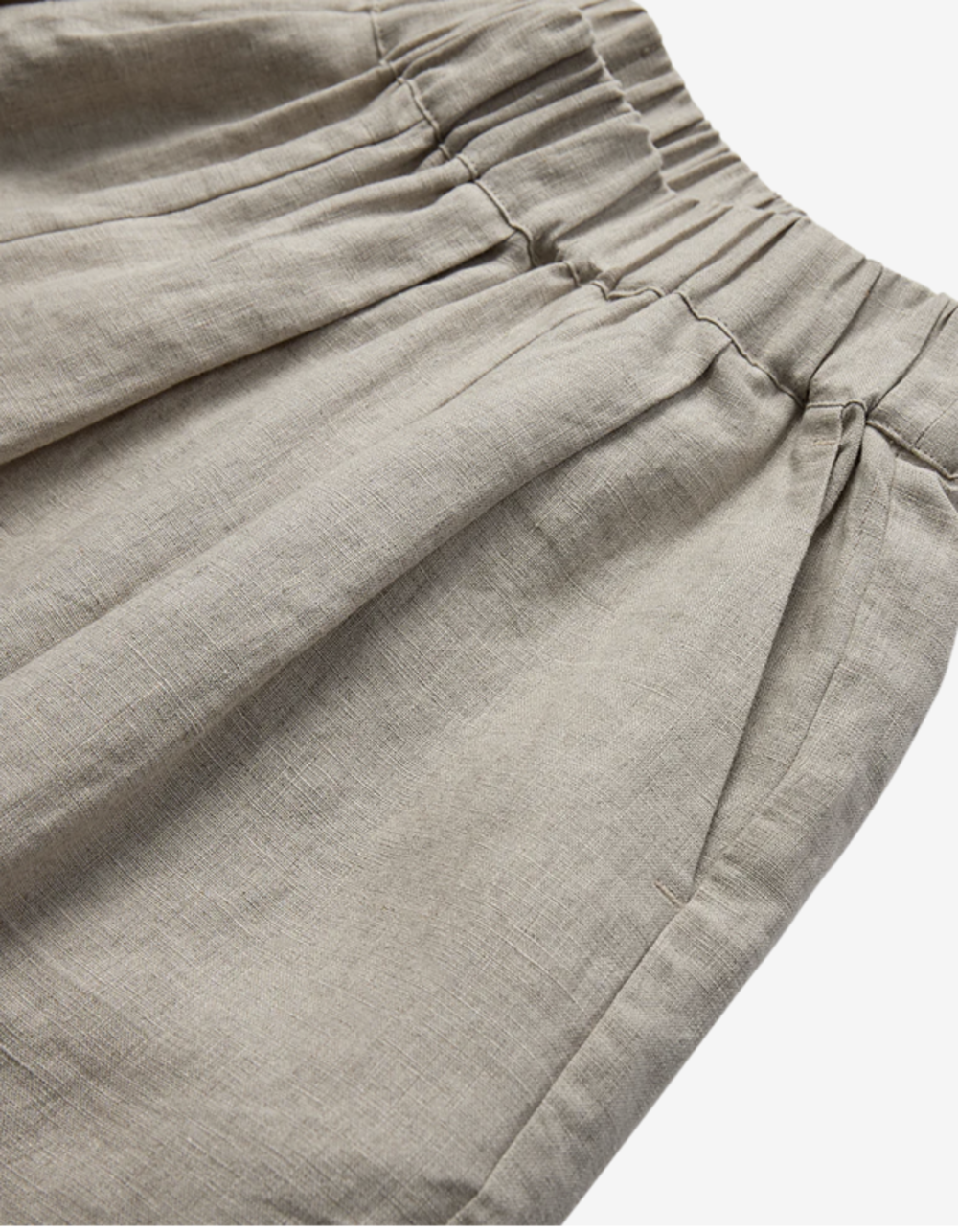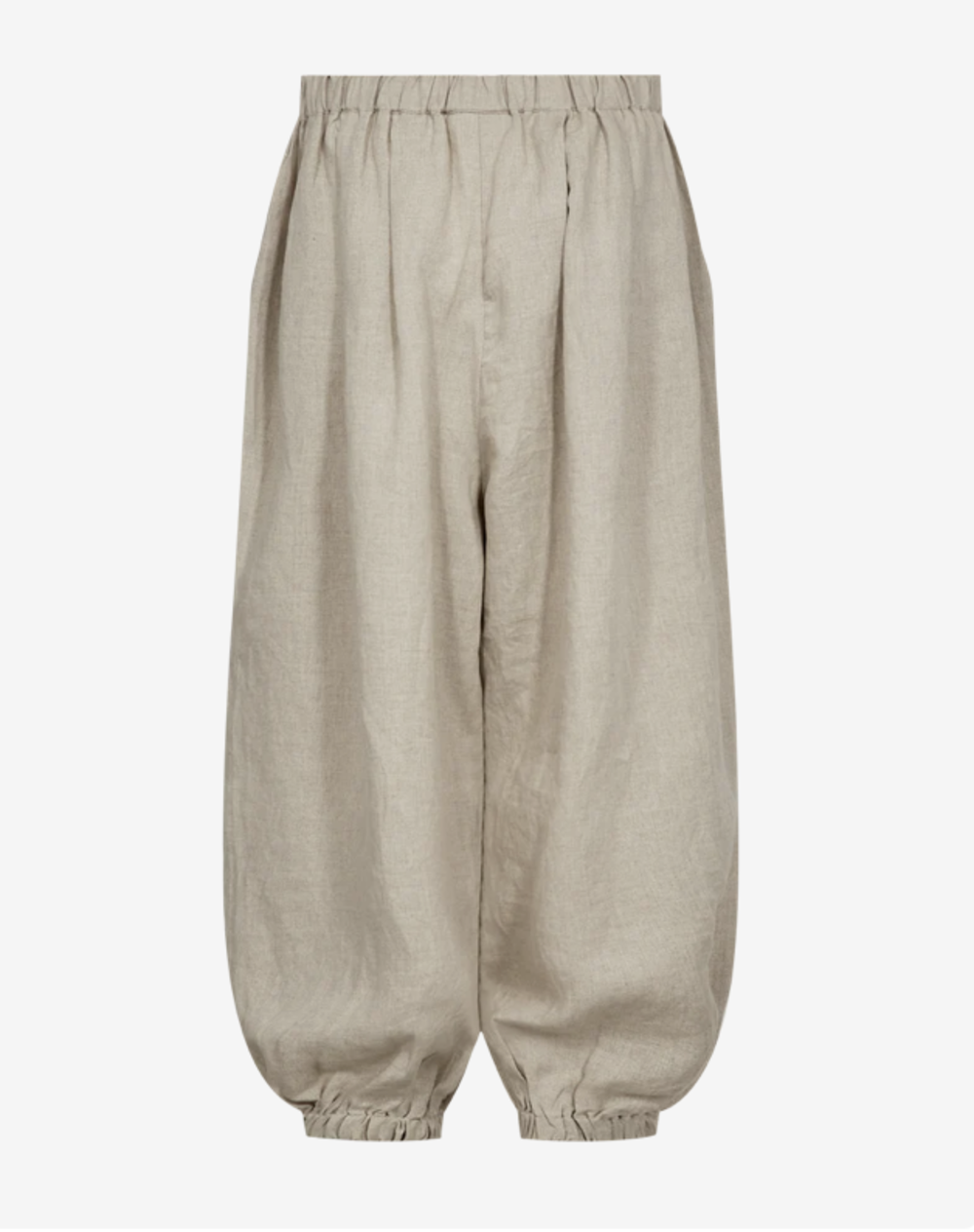 CMNATULI-PANTS is a pair of loose fitted wide balloon pants in a woven linen with elasticated waist and gathered elasticated hemline. Pleats at the waist for extra volume and slanted front pockets.