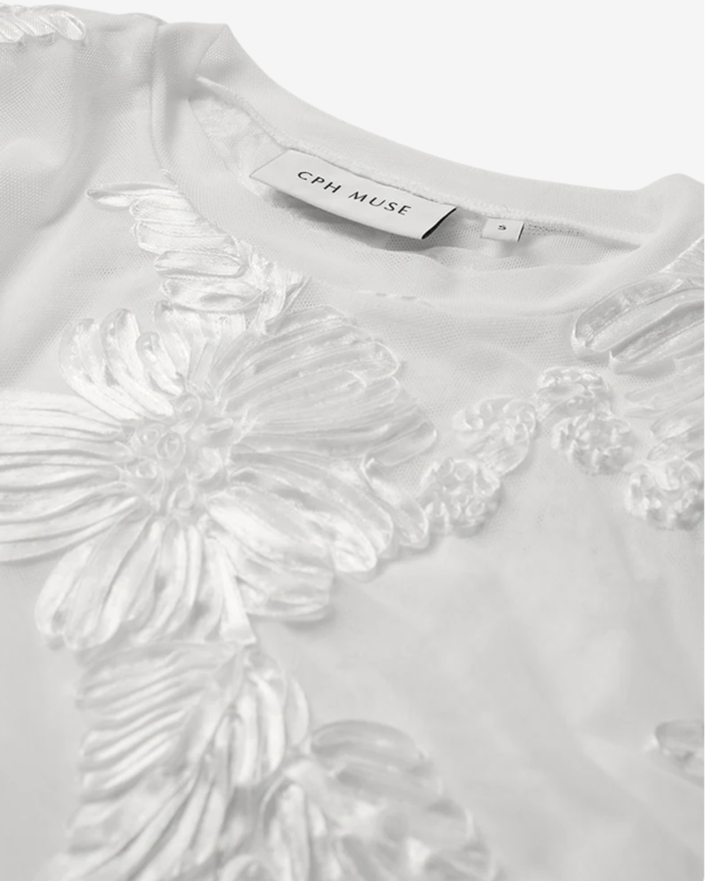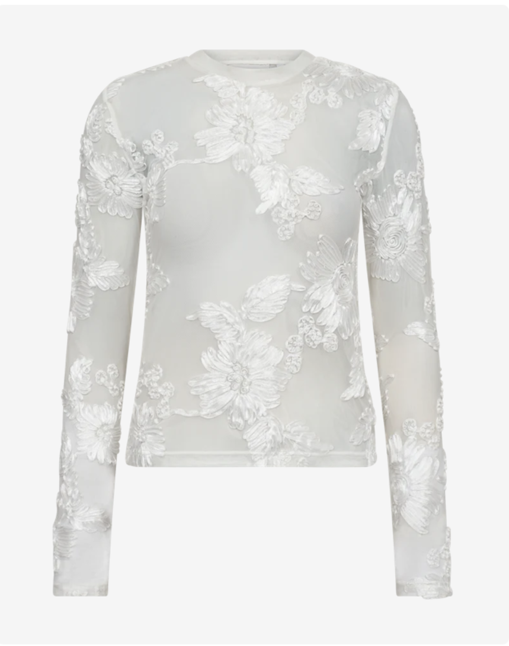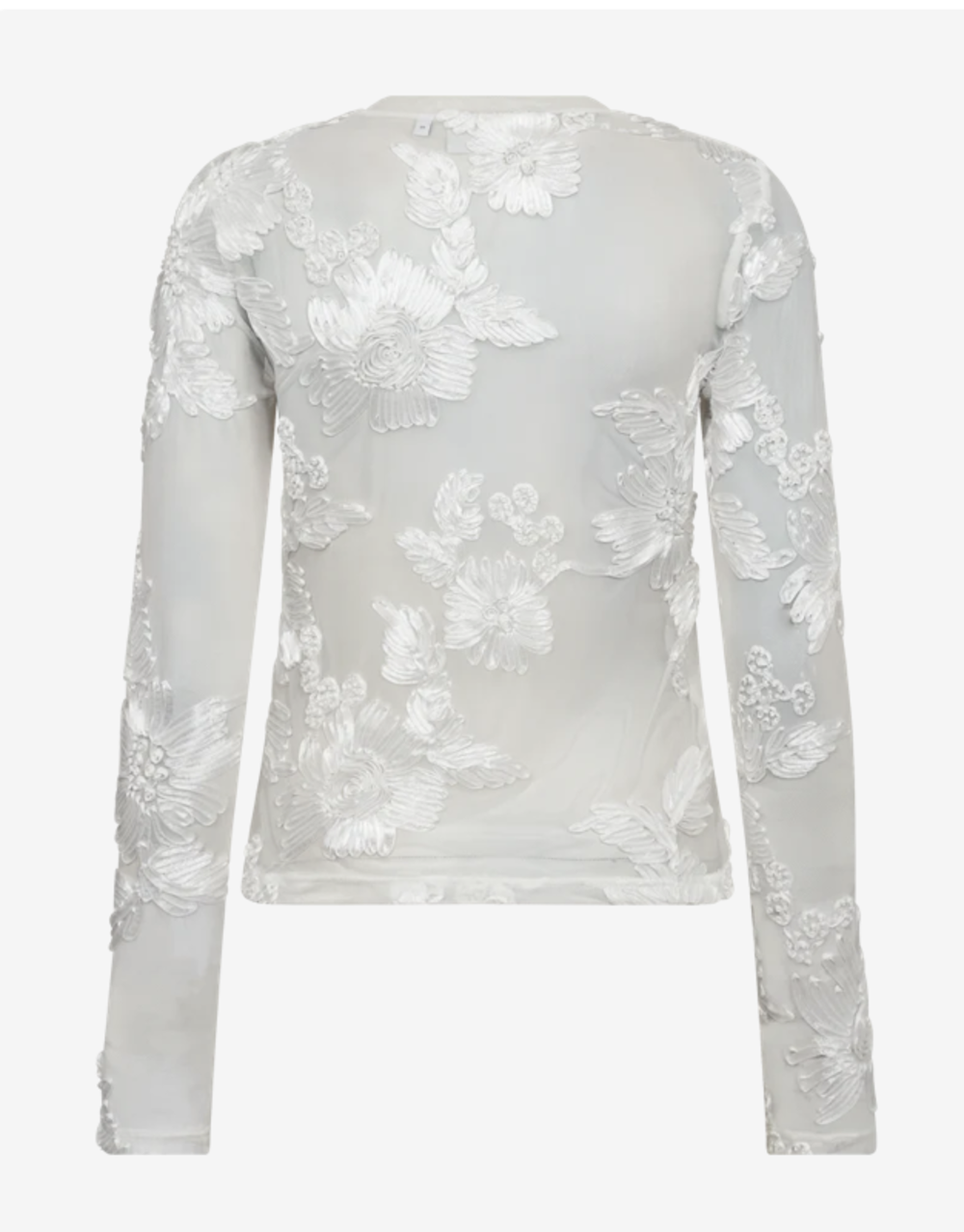 CMFLOW-BLOUSE is a blouse in a premium mesh material with a rounded neckline and long sleeves. In addition, the tights are adorned with a decorative floral structure for a refined look.