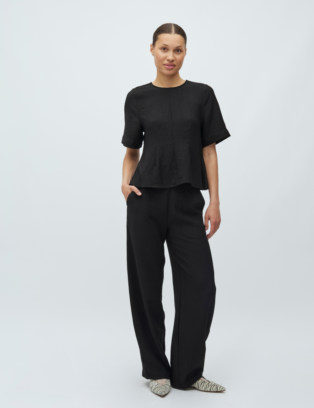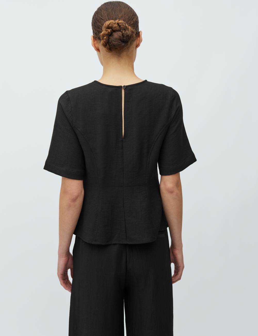 Peplum top with button and keyhole at the back. Combine with Emryn pants to suit up.