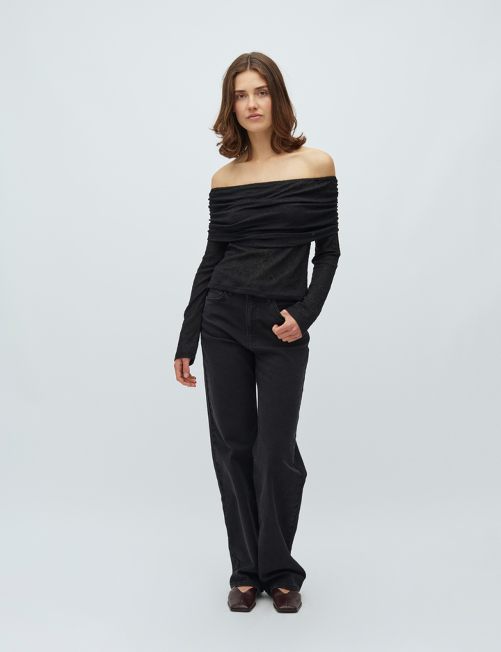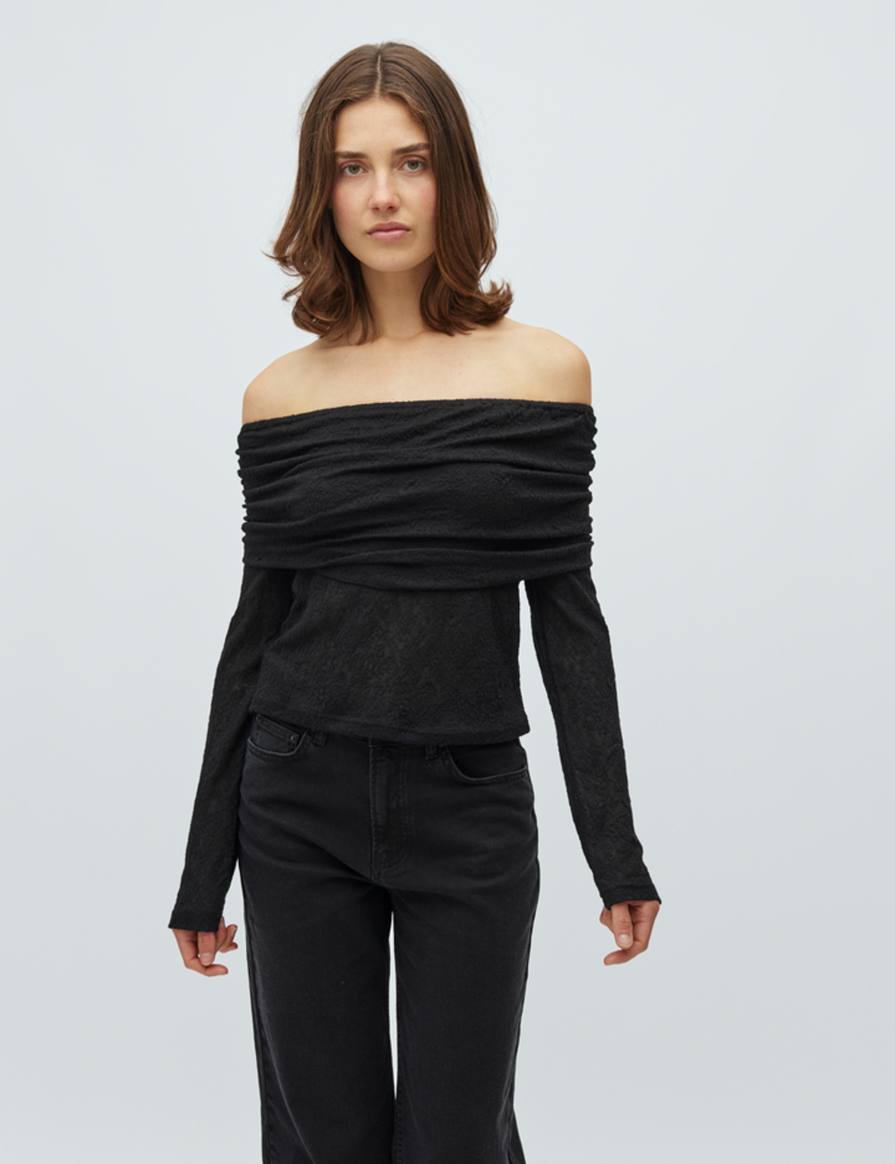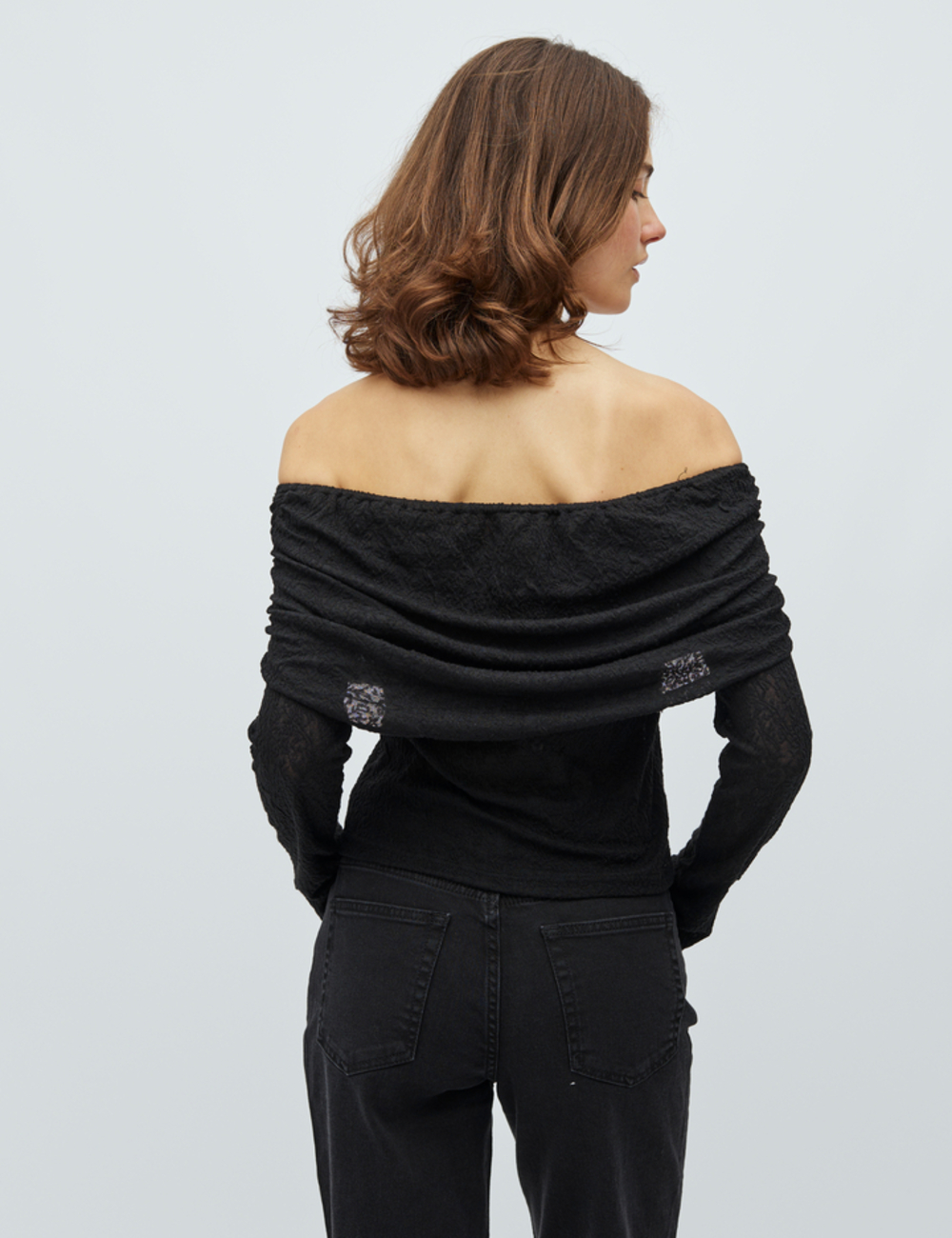 Off-shoulder top with long sleeves.