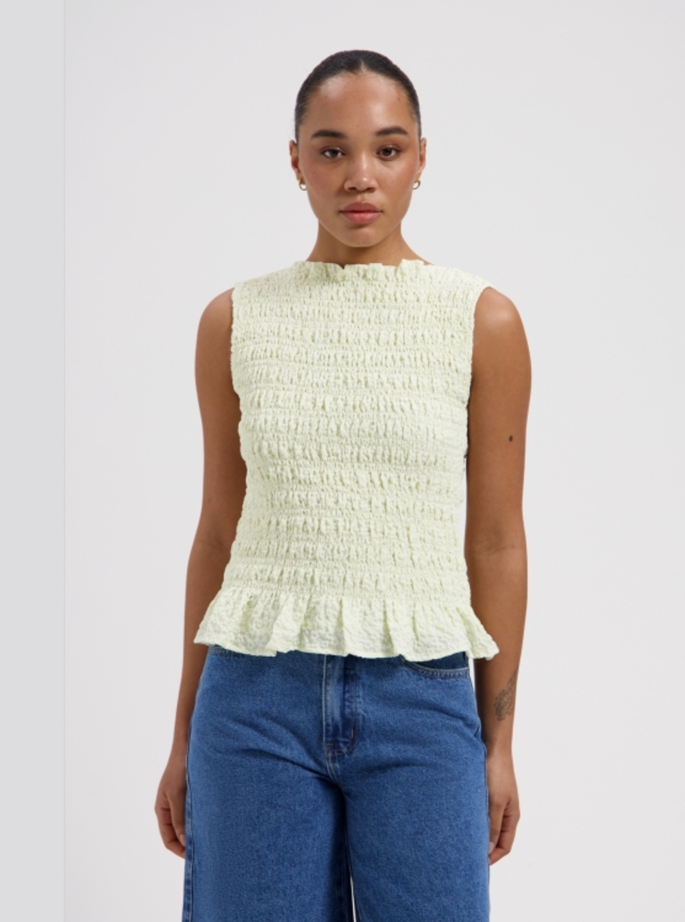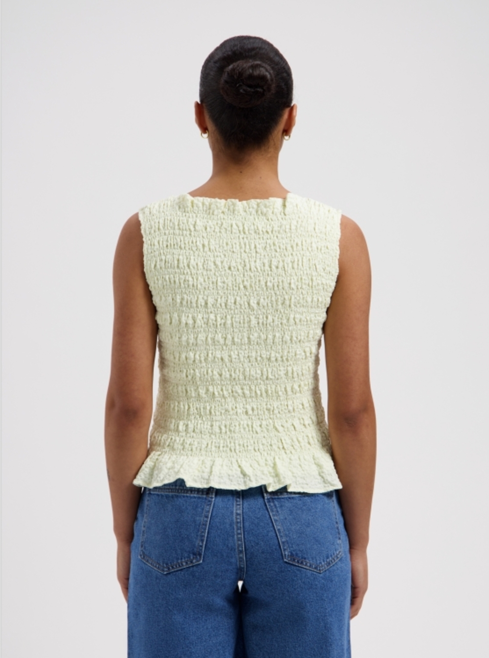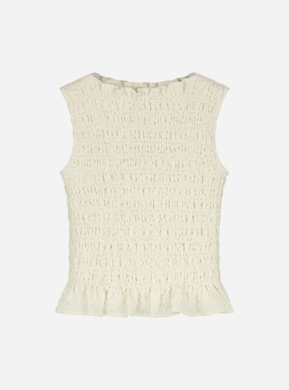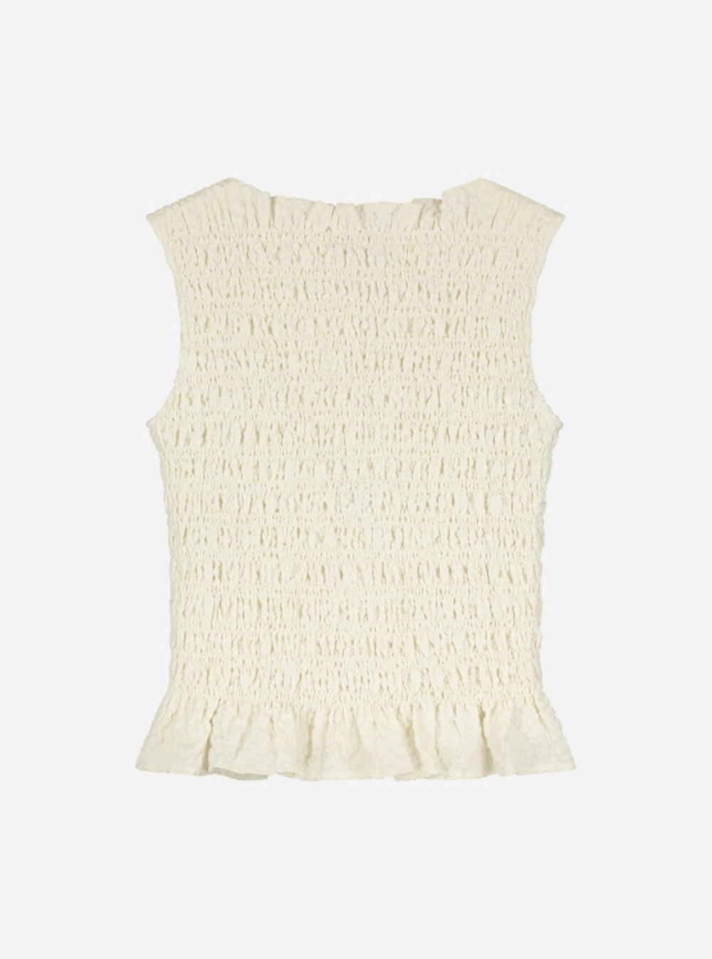 Off-white crinkle top with a flared bottom.