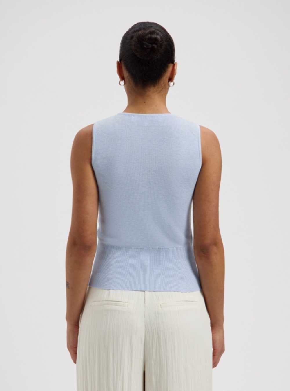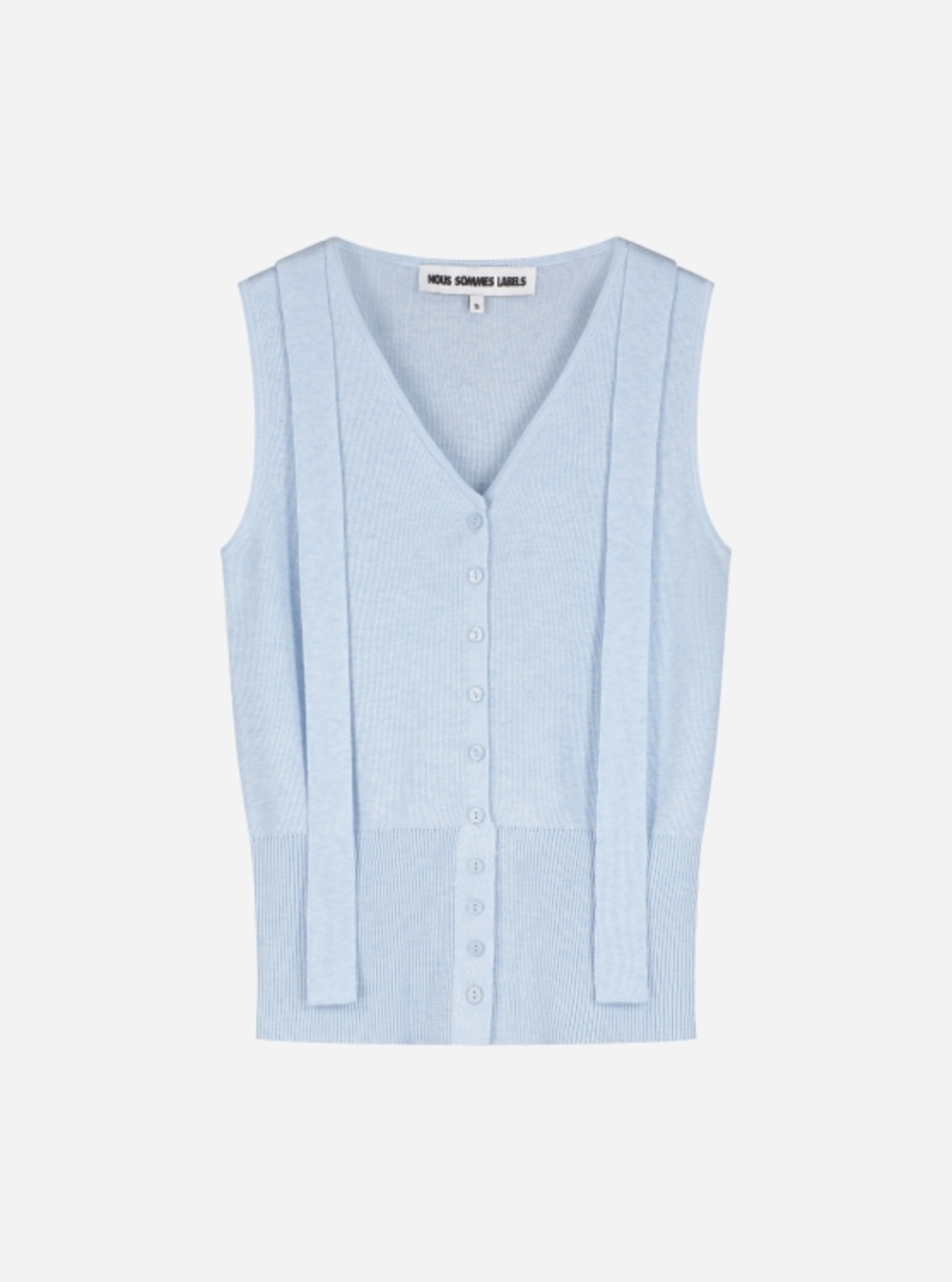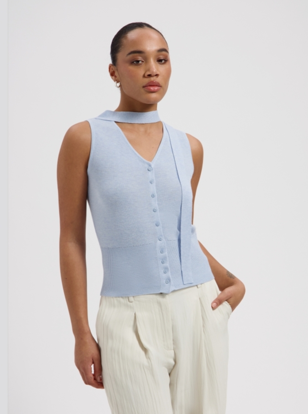 Scarf-style sleeveless top with buttons.