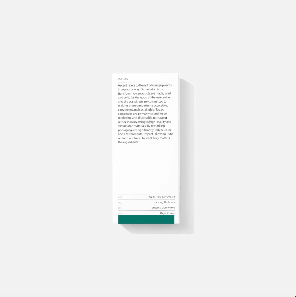Ascent Teal parfum extract is een gedurfde en kruidige geur met warme en houtachtige tonen, verweven met de rijke, aardse geur van tabak. De complexiteit wordt in balans gebracht door hints van zoete vanille en een vleugje leer, wat zorgt voor een intrigerend en mannelijk aroma dat lang blijft hangen. Met 37% parfumolie blijft hij meer dan 12 uur aanwezig. Onze geuren zijn genderneutraal – gecreëerd om door iedereen gedragen en geliefd te worden.