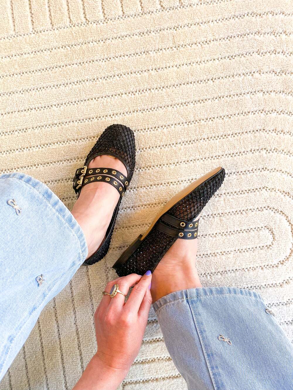 De Valletta loafer met steentjes en gouden gespen is nieuw bij DWRS. Deze elegante loafer kun je stijlen onder een lange rok of onder je favoriete broek. De loafer is aan de buitenzijde gemaakt van mesh stof en aan de binnenzijde gemaakt van leer.